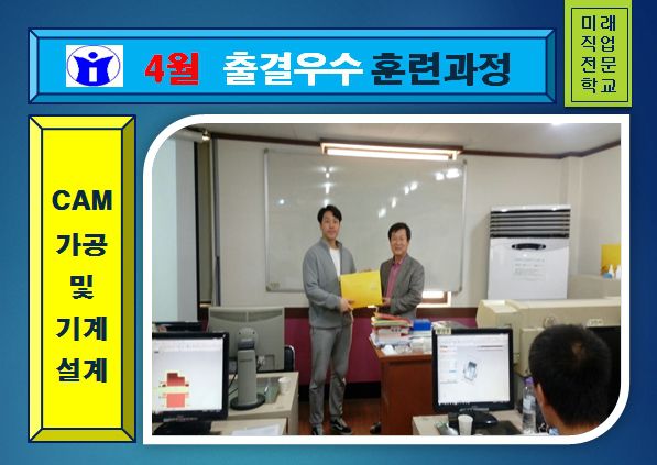 4월 출결우수훈련과정으로 CAM가공및기계요소설계과정이 선정되어 시상식이 있었습니다. 훈련생 모두가 철저한 출결관리를 통해 반분위기 조성으로 훈련성과를 달성할 수 있도록 계속적인 매진을 당부드리며 축하를 드립니다.