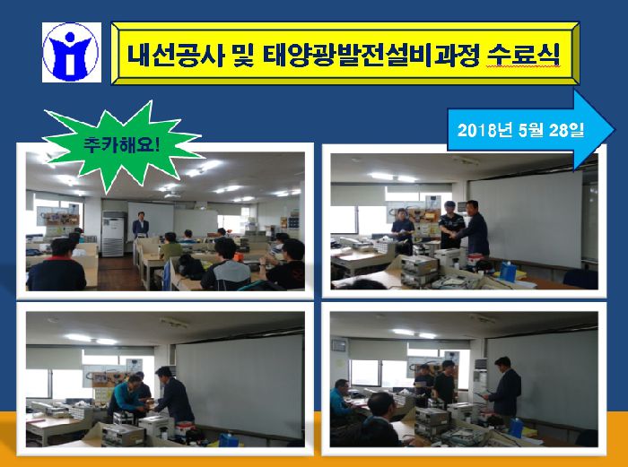 2018년 5월 28일 내선공사 및 태양광발전설비과정 수료식이 있었습니다. 그동안 정말 수고 많으셨구요. 앞날에 항상 좋은일로만 가득하길 바라며 웃음 또한 가득한 한해되시길 바랄께용...언제나 미래직업전문학교가 함께 하도록 하겠습니다. 수고많으셨습니다.