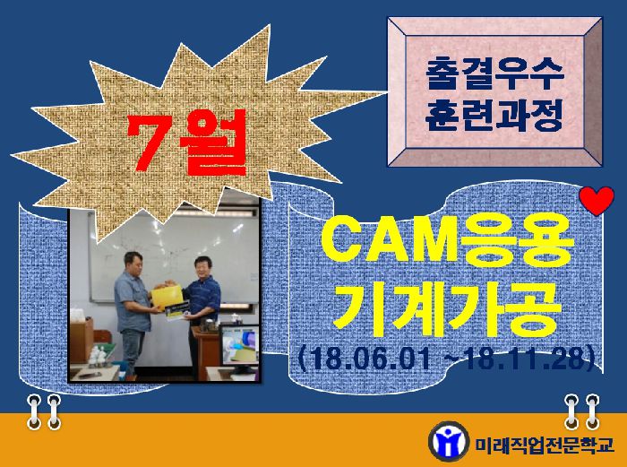 7월 출결우수훈련과정으로 cam응용기계가공과정이 선정되어 시상을 하였습니다. 무더운 날씨에도 불구하고 거의 완벽에 가까운 출결을 보여주신 훈련생들께 깊이 감사드리며 더불어 담임인 이승범선생님의 노고에도 박수를 드립니다. 남은 여름또한 아자아자 힘내시길 바랍니다.