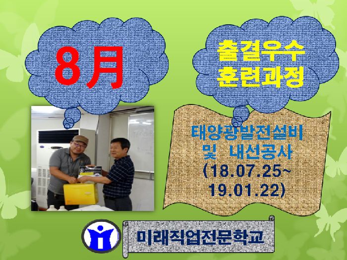 8월달 출석왕으로 태양광발전설비 및 내선공사(2018,07,25~2019.01.22)과정반으로 선정되었습니다. 유난히 무더웠던 여름 날씨에도 불구하고 출석왕반으로 선정되시점...축하드립니다. 9월달에도 도전하는 모습... 기대할께용.