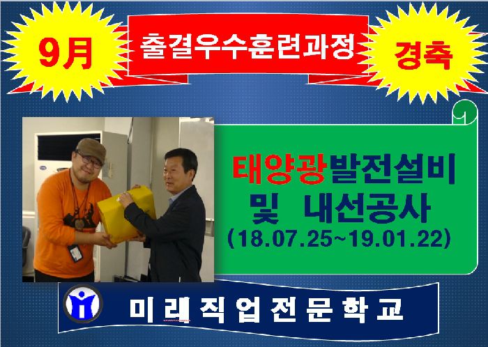 2018년 10월 5일 9월 출결우수훈련과정으로 태양광발전설비 및 내선공사(18.07.25~19.01.22)과정으로 선정되었습니다. 지난 무더운 날씨에도 불구하고 8월출석왕을 이어 연속으로 출석왕반이 되셨네용...김경남 담임선생님을 비롯하여 학생들의 노력에 거듭 박수를 드립니다. 컨디션조절잘하시고..건강유의하세용