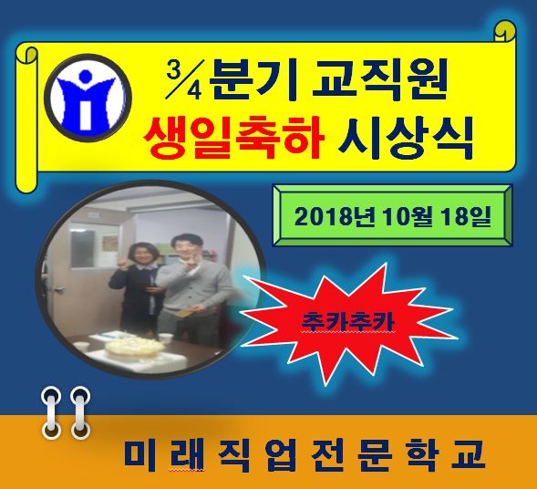 2018년 10월 18일 미래직업전문학교 교직원 3/4분기 생일축하 시상식이 있었습니다. 남윤욱쌤 축하드립니다. 가을날씨 만끽하시고 건강유의하세용.
