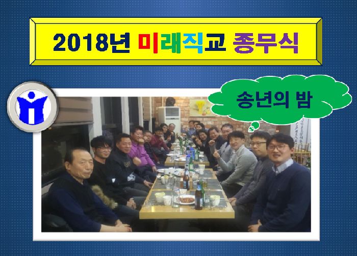 2018년 12월 28일...한해를 마무리하는 종무식이 있었습니다. 저희 미래직업전문학교 교,강사 모든분들...정말 고생많으셨습니다. 새해복 많이많이 받으시고... 건강유의하시고...2019년도엔 웃음가득한 일들로만 풍성했으면 하는 바람을 가져봅니다. 해피뉴이어~~~~~