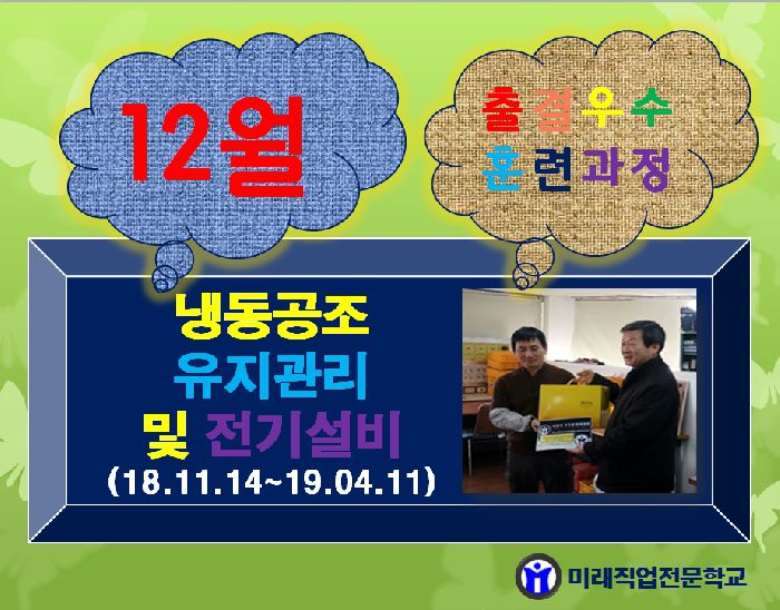 2018년도 12월 마지막 출결우수훈련과정으로 냉동공조 유지관리 및 전기설비(18.11.14~19.04.11)과정이 선정되었습니다. 정말 축하드립니다. 하루하루 기분좋은 날 되시고, 저희 미래직교가 항상 응원하겠습니다. 냉동공조 화이링~~~