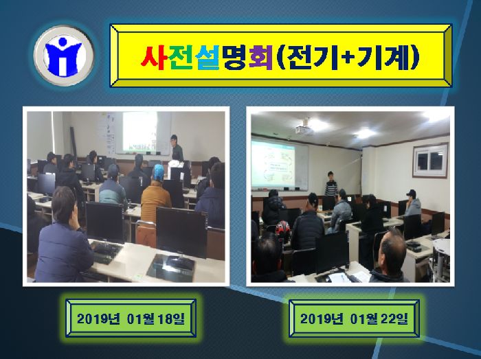 2019년 01월 18일, 2019년 01월 22일 두차례에 걸쳐 전기와 기계분야 사전설명회 시간을 가졌습니다. 많은 예비훈련생들이 참여하시어 저희 미래직업전문학교를 빛내주셨네요...한분도 빠짐없이 개강시에 뵙기를 기대하며...조만간 다시 뵙겠습니다. 건강유의하십시오.