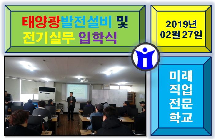 2019년 02월 27일 태양광발전설비 및 전기실무(자격취득)(2019.02.27~2019.12.19)과정의 입학식이 있었습니다. 반갑습니다. 올해 첫 만남을 저희 미래직업전문학교와 함께 해 더더욱 의미가 깊은듯합니다. 앞으로 저희 학교에서 많은정보를 얻어가시길 바라겠습니다. 수료일까지 무탈하게 전원 수료할수있기를 기대해봅니다. 태양광홧팅~~