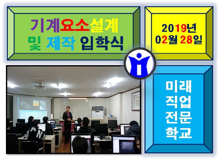 2019년 02월 28일 기계요소설계 및 제작(2019.02.28~2019.12.20)과정 입학식이 있었습니다. 10개월동안 계획을 잘 세우셔서 뜻하는바 다~~ 이루시길 바라며, 또한 저희 미래직업전문학교가 많이 도와드리겠습니다. 기계요소설계 화이링!!!