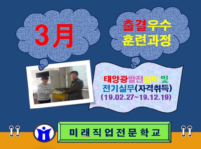 2019년 3월의 출석왕반으로 태양광발전설비 및 전기실무(자격취득)과정이 선정되었습니다. 2019년도 첫개강을 한 과정이라 더더욱 의미가 있는듯합니다. 이마음... 이기상으로...언제나 홧팅하시길 바래요. 축하드립니다.
