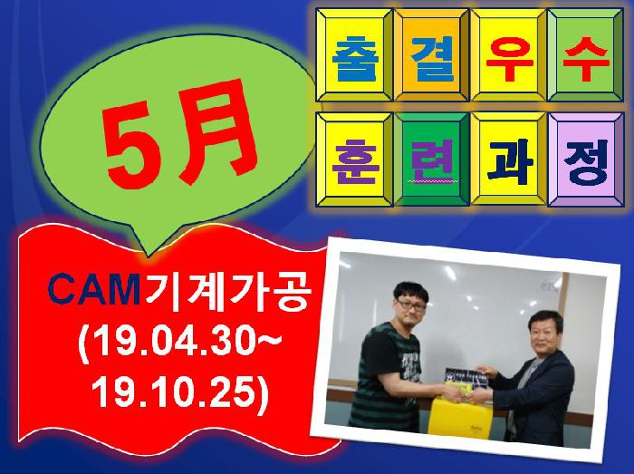 2019년 6월 12일...5월 출결우수훈련과정으로 cam기계가공양성(2019.04.30~2019.10.25)과정이 선정되었습니다. 첫마음가짐..그대로 그리고 앞으로도 홧팅입니다.