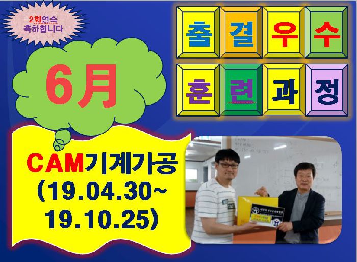 2019년 7월 4일...6월의 출결우수훈련과정으로 CAM기계가공양성(19.04.30~19.10.25)과정이 연속으로 선정되었습니다. 진심으로 축하드립니다. 무더운 여름...잘 이겨내시고...언제나 홧팅하시길..바래용~~