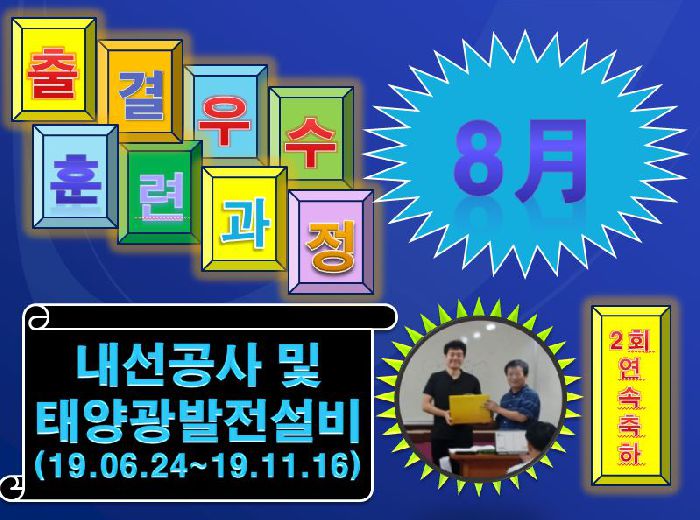 2019년 9월 3일...8월의 출결우수훈련과정으로 내선공사 및 태양광발전설비(19.06.24~19.12.16)과정이 두번연속..으로 선정되었습니다. 무덥고 힘든날씨속에 출결우수과정으로 선정되신점...진심으로 축하드립니다. 남은 여름동안 건강유의하시고...하루하루 보람되고, 기분좋은날되셨슴.합니다.