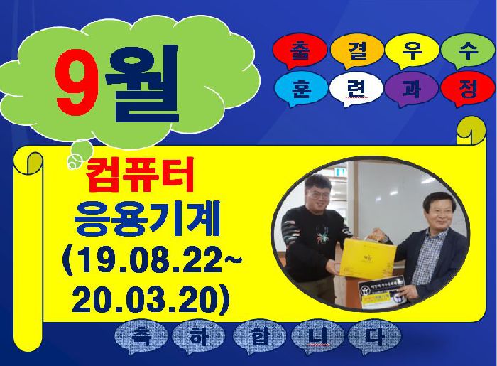 2019년 10월 02일... 9월의 출결우수훈련과정으로 컴퓨터응용기계과정이 선정되었습니다. 입학한 첫맘... 그대로 수료날까지 화이링입니다. 건강유의하시고 다음달도 기대해볼께용.