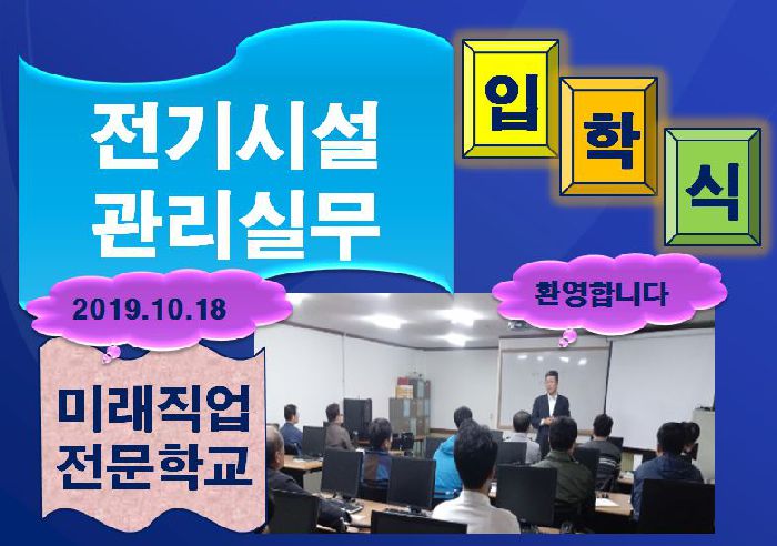 2019년 10월 18일 전기시설관리실무(19.10.18~20.03.11) 과정의 개강이 시작되었습니다. 20년 3월 11일까지 건강관리 잘하셔서...계획한대로 잘 마무리 지을 수 있도록...그리고 취업에 성공할수 있도록... 저희 미래직업전문학교가 항상 도와드리겠습니다. 전기시설관리실무...언제나 홧팅입니다.~~~