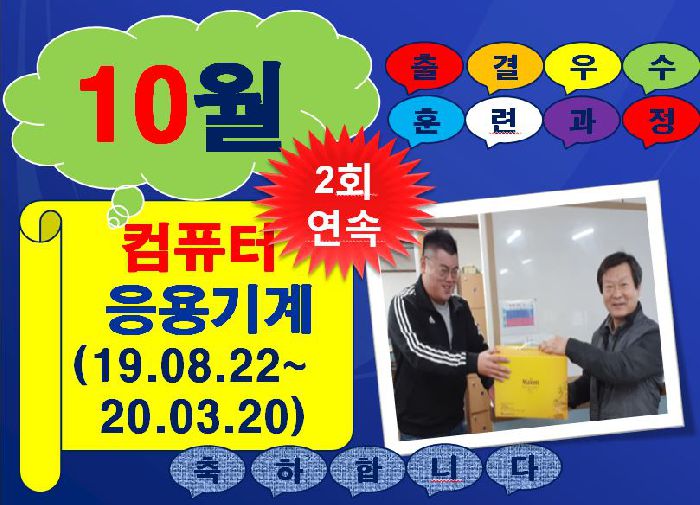 2019년 11월 07일...10월의 출결우수훈련과정으로 컴퓨터응용기계과정이 선정되었습니다. 2회연속으로 우수훈련과정으로 선정되신점...진심으로 축하드립니다. 앞으로도 기대해볼께용..언제나 홧팅입니다.