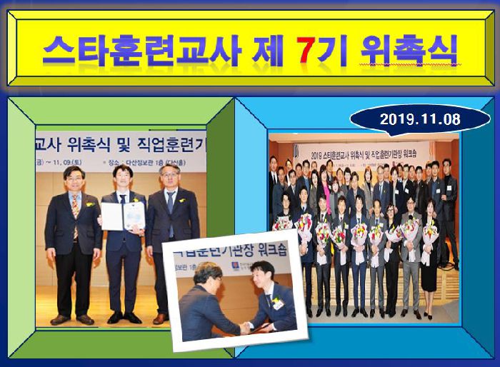 2019년 11월 08일...한국기술교육대학교에서 2019년 스타훈련교사 제7기 위촉식에...저희 본교 남윤욱 교사가 참석하였습니다. 당당히 스타훈련교사로 선정이 되어 ...즐거운 발걸음으로 참석했을듯 합니다. 정말 저희 본교입장에서는 경사가 아닐 수 없습니다. 지난 9월 노동부장관 수상과 더불어 스타훈련교사까지 수상하게되니...더할나위없이 좋은날들이 이어지고 있습니다... 2020년에도 한층 발전하는 미래직업전문학교를 기대하며.. 언제나홧팅입니다.