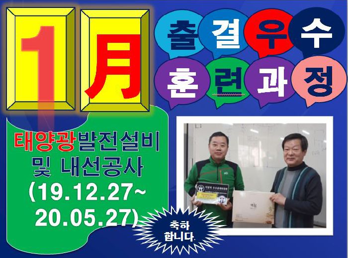 2020년 02월 06일... 20년도 1월의 출결우수훈련과정으로 태양광발전설비 및 내선공사(19.12.27~20.05.27)과정이 선정되었습니다. 축하합니다. 첫마음 그대로 수료날까지 홧팅하시길 바랍니다. 저희 미래직교도 항상 도움을 줄수있도록 노력하겠습니다. 언제나 홧팅입니다.~~