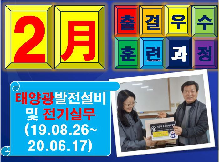 2020년 3월 9일...2월의 출결우수훈련과정으로 태양광발전설비 및 전기실무(19.08.26~20.06.17)과정이 선정되었습니다. 축하드립니다. 다음에도 한번더 기대해볼께용~~~태양광반 언제나홧팅입니다.