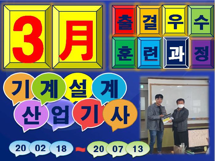 2020년 3월의 출결우수훈련과정으로 기계설계산업기사과정이 선정되었습니다. 축하합니다. 첫맘그대로...다음달에도 기대해볼께용~~
