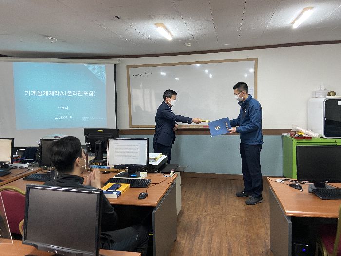 2021년 5월 18일 기계설계제작(원격보조 포함)과정의 수료식이 있었습니다. 그동안 정말 수고 많으셨고, 100%취업으로 앞날에 좋은일로만 가득할 수 있도록 미래직업전문학교가 여러분과 함께 하도록 하겠습니다.