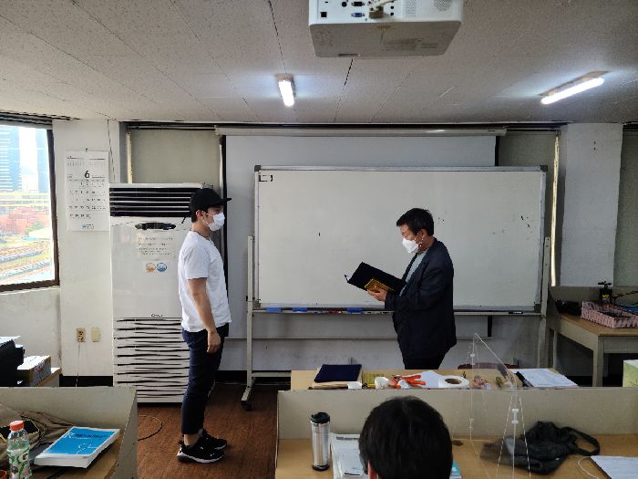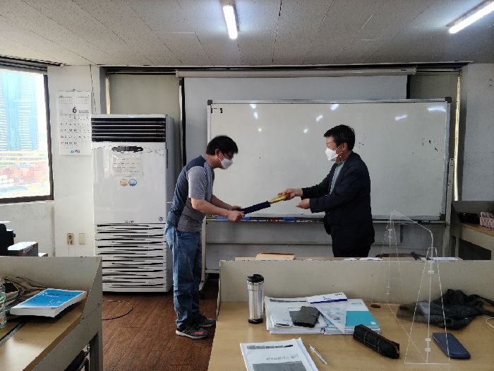 2021.6.23(수) 공조냉동기계산업기사(A)과정의 수료식이 있었읍니다. 그동안 수고 많으셨고 이제 7월 12일~16일 과정형 외부평가와 취업성공만 남았읍니다. 잘 준비하여 공조냉동기계산업기사 국가자격증을 100% 취득하고 취업성공을 할 수 있도록 본교도 여러분과 함께 노력하겠읍니다.