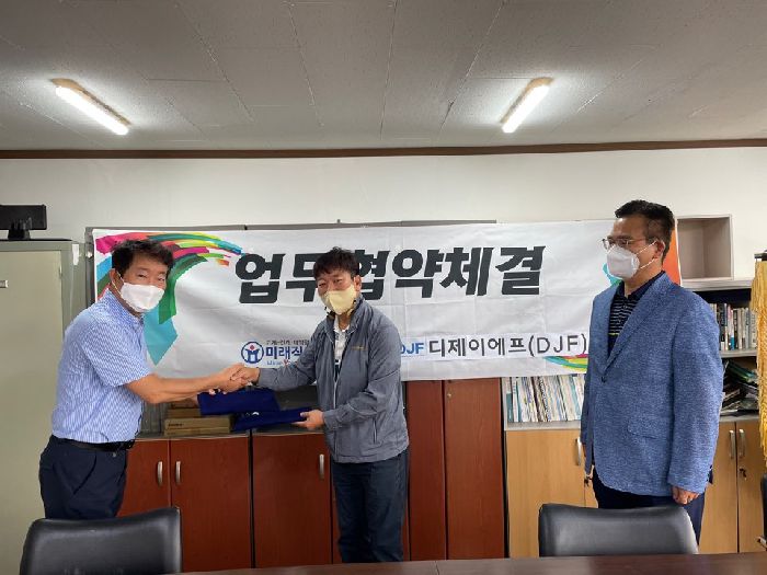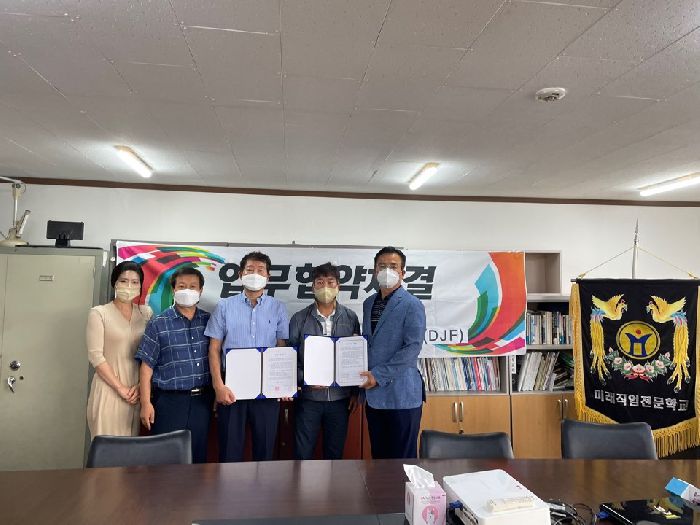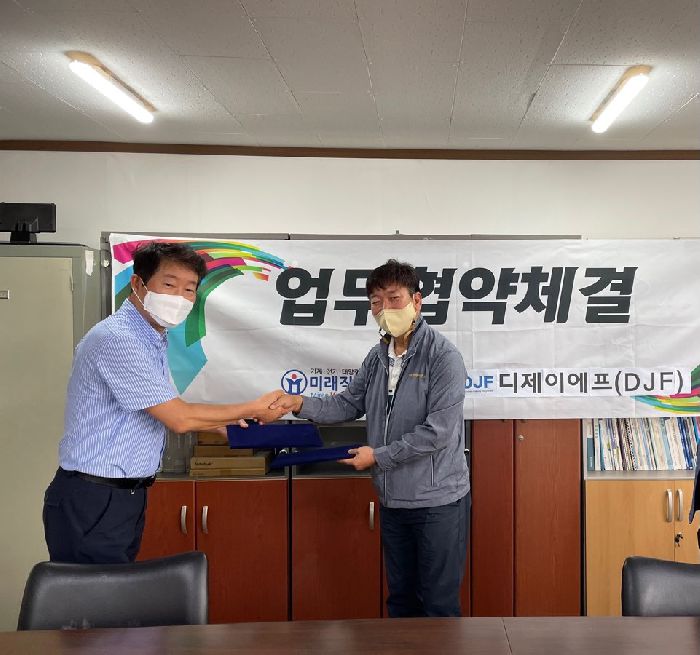 2021.8.18(수) 14:00 미래직업전문학교와 디제이에프(DJF)는 병력특례업체, 강소기업으로 기계설계및 가공직종 훈련생들에게 배우면서 성장할 수 있는 최선의 취업 기회를 제공하고, 지역 소재기업의 원활한 인재채용을 지원하기 위하여 업무협약(MOU) 체결을 하였습니다.